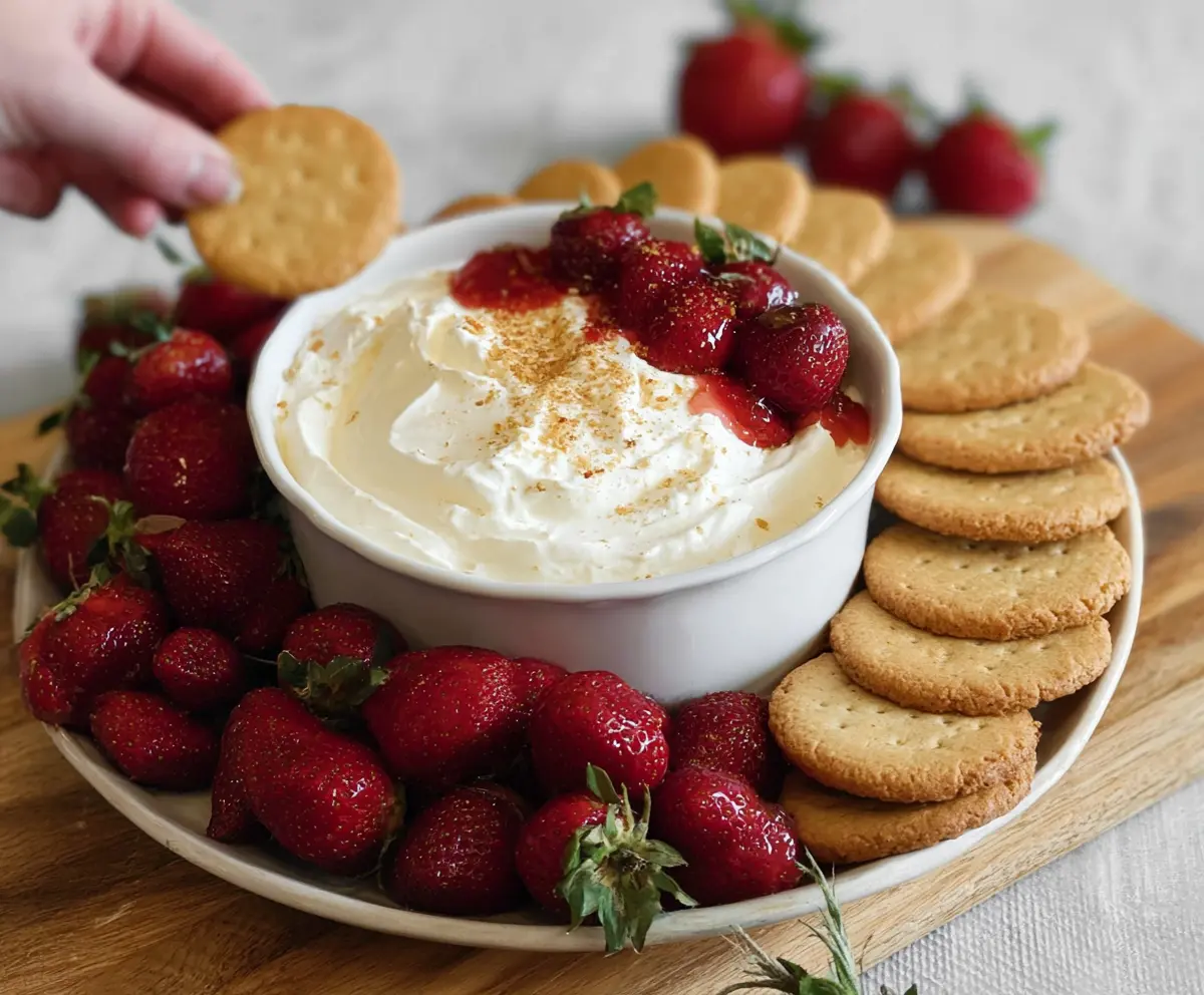 For a touch of extra color, add fresh strawberries and raspberries either as a garnish on top of the dip or on the side. They’re perfect for dipping and pair wonderfully with the creamy dip!
