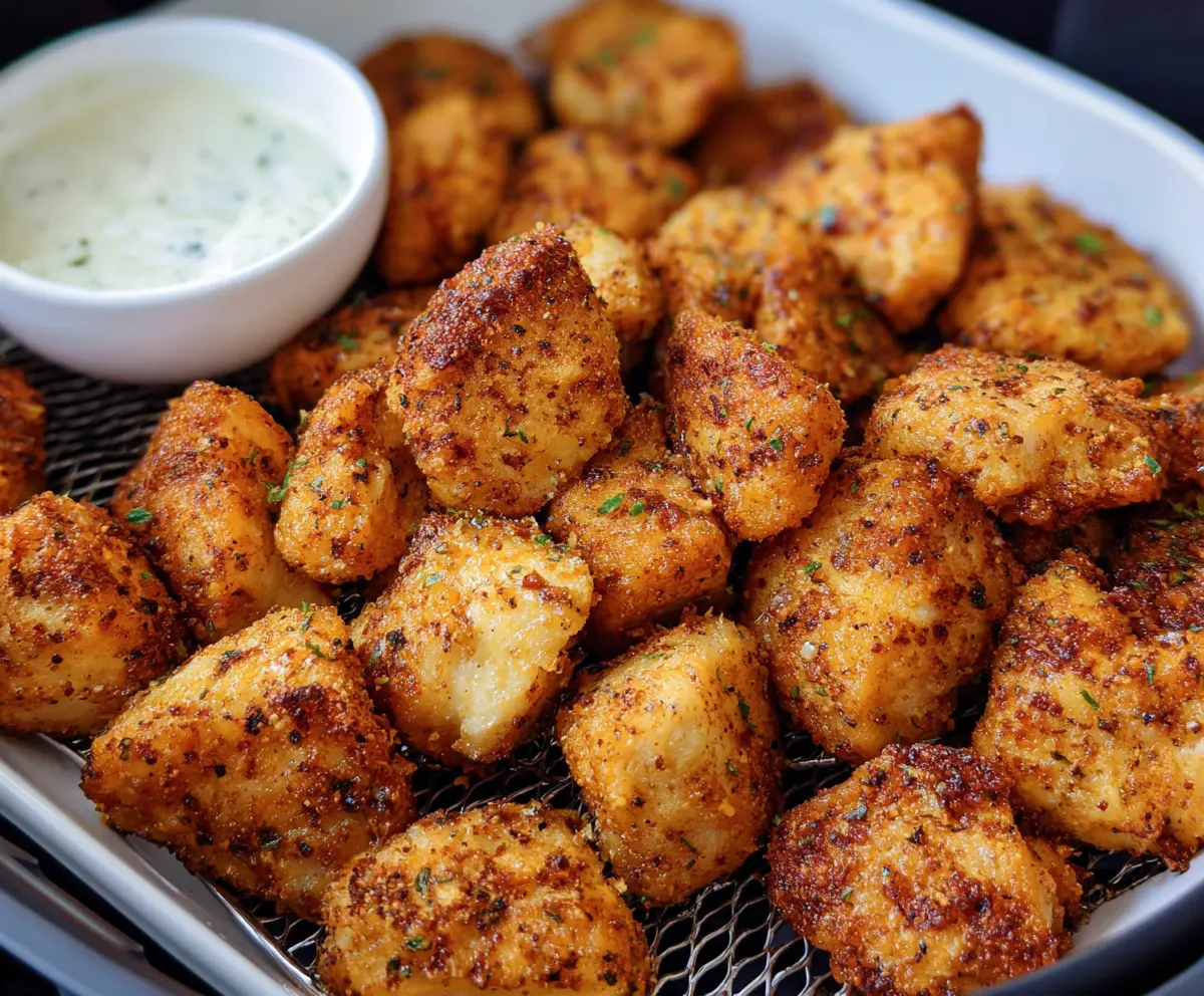 Once cooked, carefully remove the chicken bites from the air fryer. Let them rest for a couple of minutes—this helps them settle and makes them even tastier.