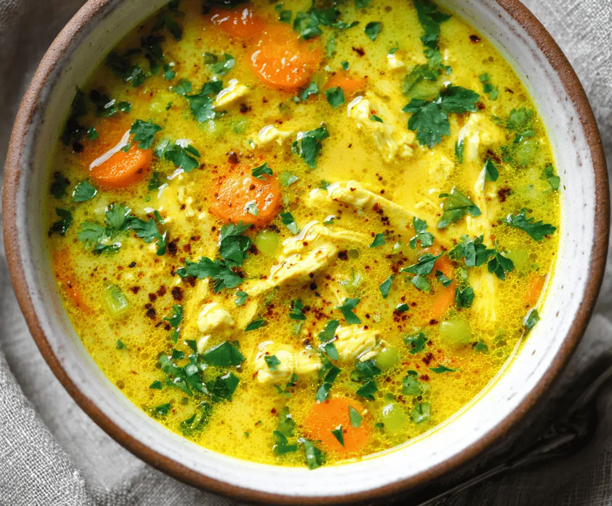 Creamy turmeric chicken soup with fresh herbs and vegetables, promoting anti-inflammatory benefits and comforting flavor.