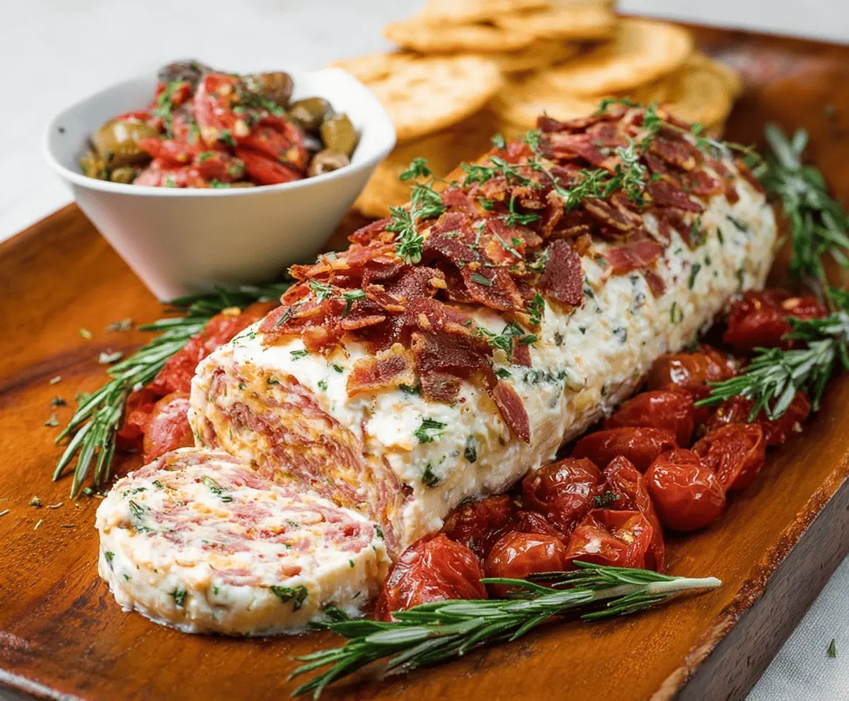 When you’re ready to serve, carefully unwrap the cheese log. Place it on a wooden serving platter or board. Top it off with additional garnishes like chopped crispy bacon or pepperoni, halved cherry tomatoes, whole olives, and sprigs of fresh rosemary for a colorful, inviting presentation.