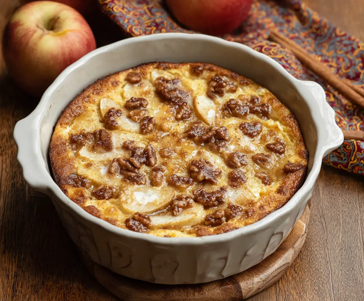 Delicious Apple Cinnamon Cottage Cheese Bake served in a baking dish with cinnamon sticks and fresh apple slices.