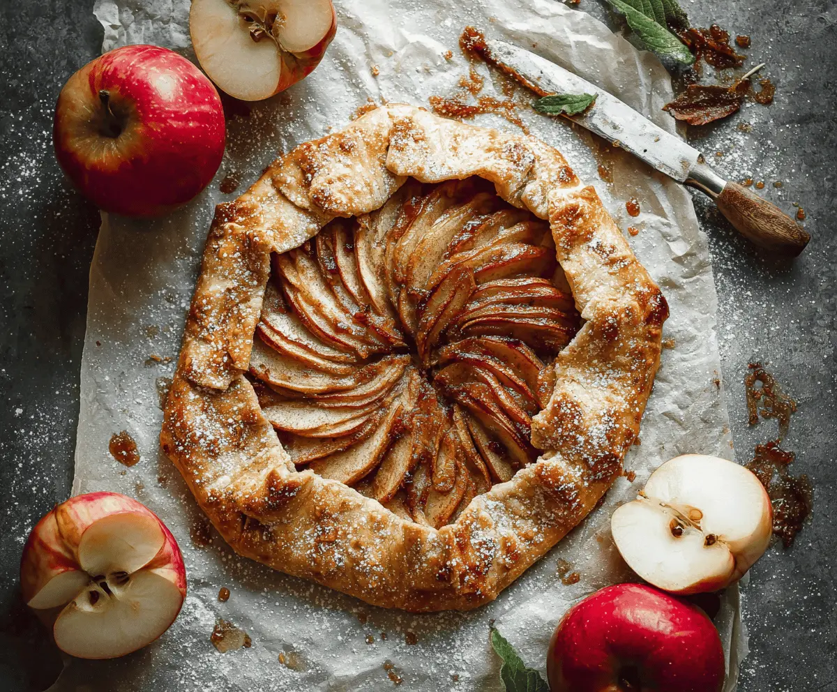 Delicious homemade apple galette with golden crust and caramelized apple slices on a rustic wooden table
