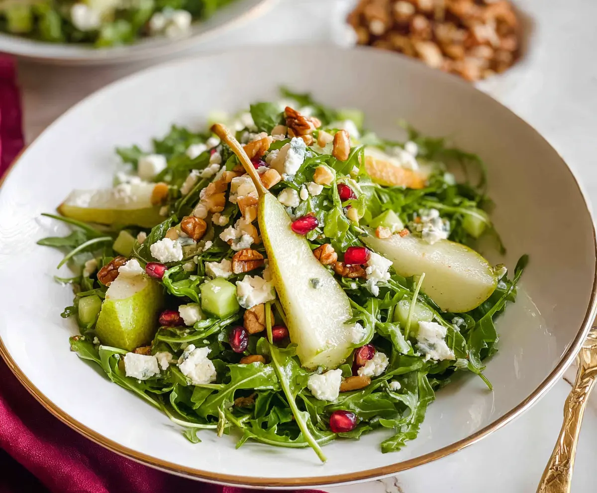 This fresh arugula pear salad is a tasty mix of peppery greens and sweet, juicy pears. Tossed with nuts and a light dressing, it’s a delightful meal or side!