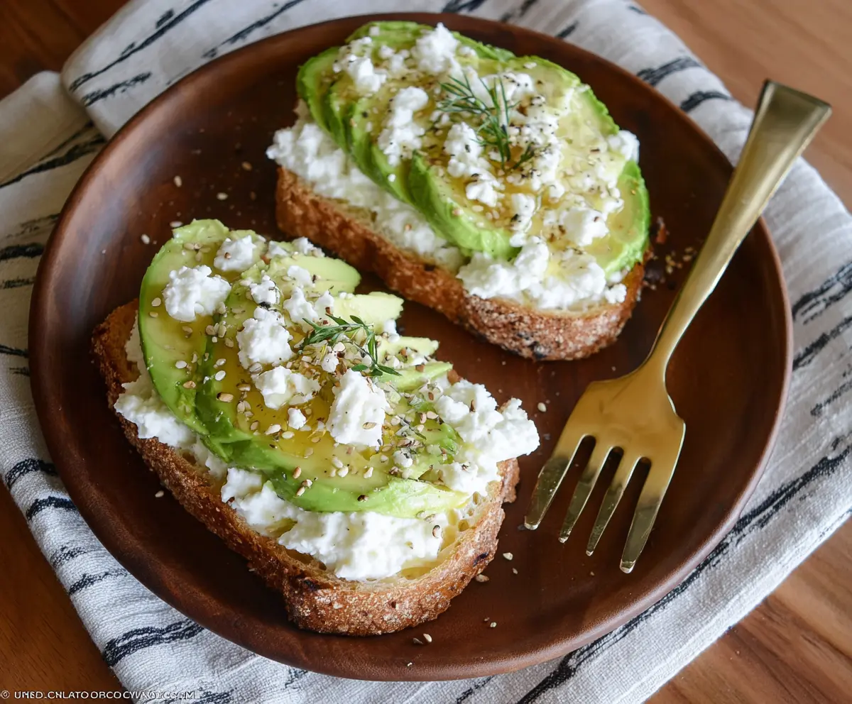 Delicious avocado toast topped with cottage cheese and drizzled with honey, perfect for a healthy breakfast.