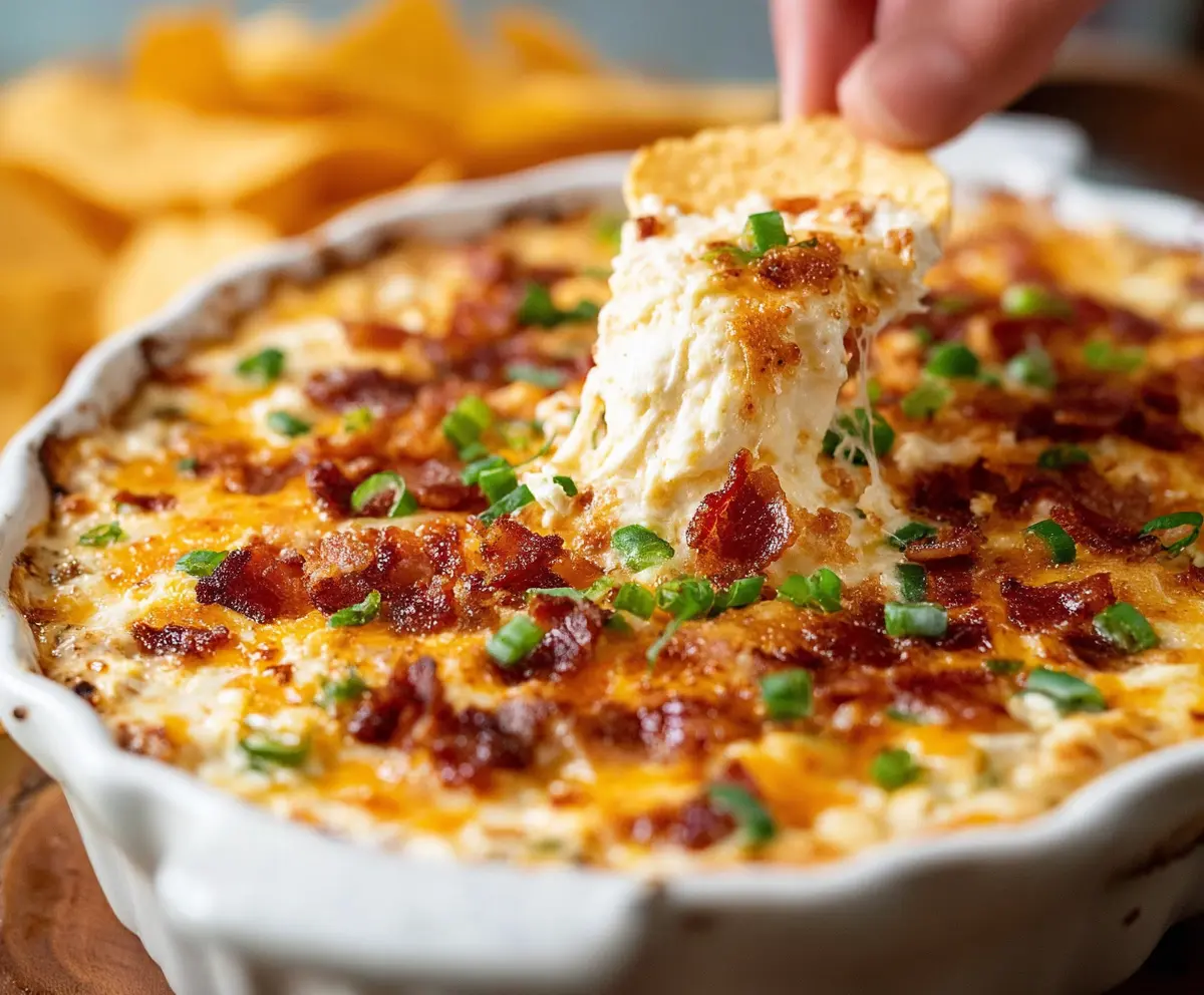 When the dip is done, carefully remove it from the oven. Let it cool for a few minutes (it’ll be hot!). Serve it warm with tortilla chips, crackers, or fresh veggies for dipping. Enjoy every cheesy, bacon-filled bite!