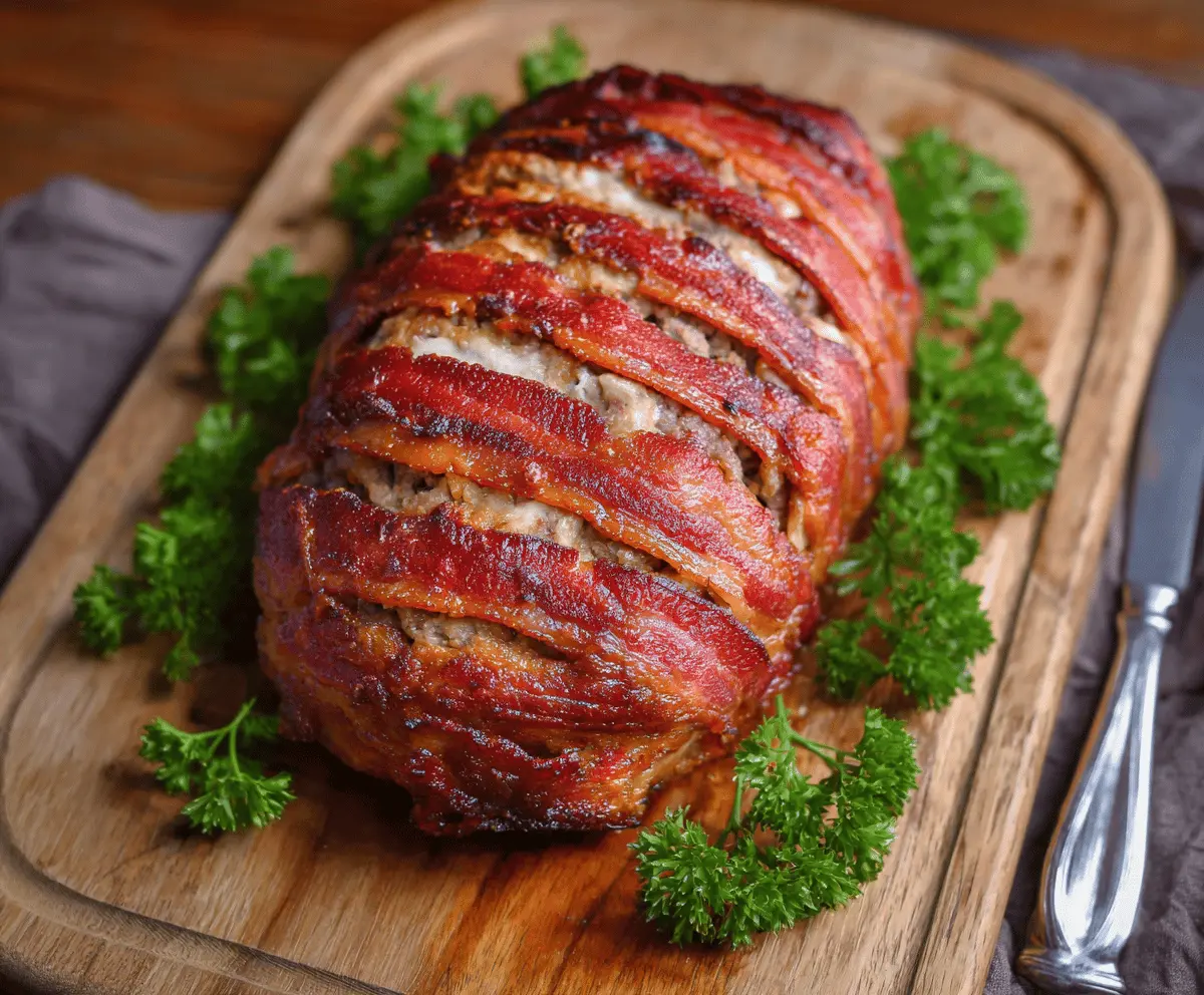 Garnish with chopped fresh parsley for a pop of color and serve warm with your favorite sides. Enjoy your amazing bacon-wrapped meatloaf!