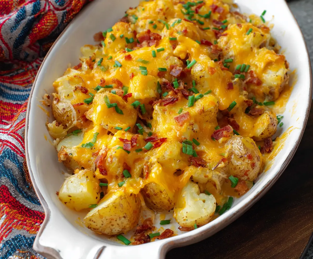 Golden baked cheddar ranch potatoes topped with melted cheese and fresh herbs, perfect for a delicious side dish.