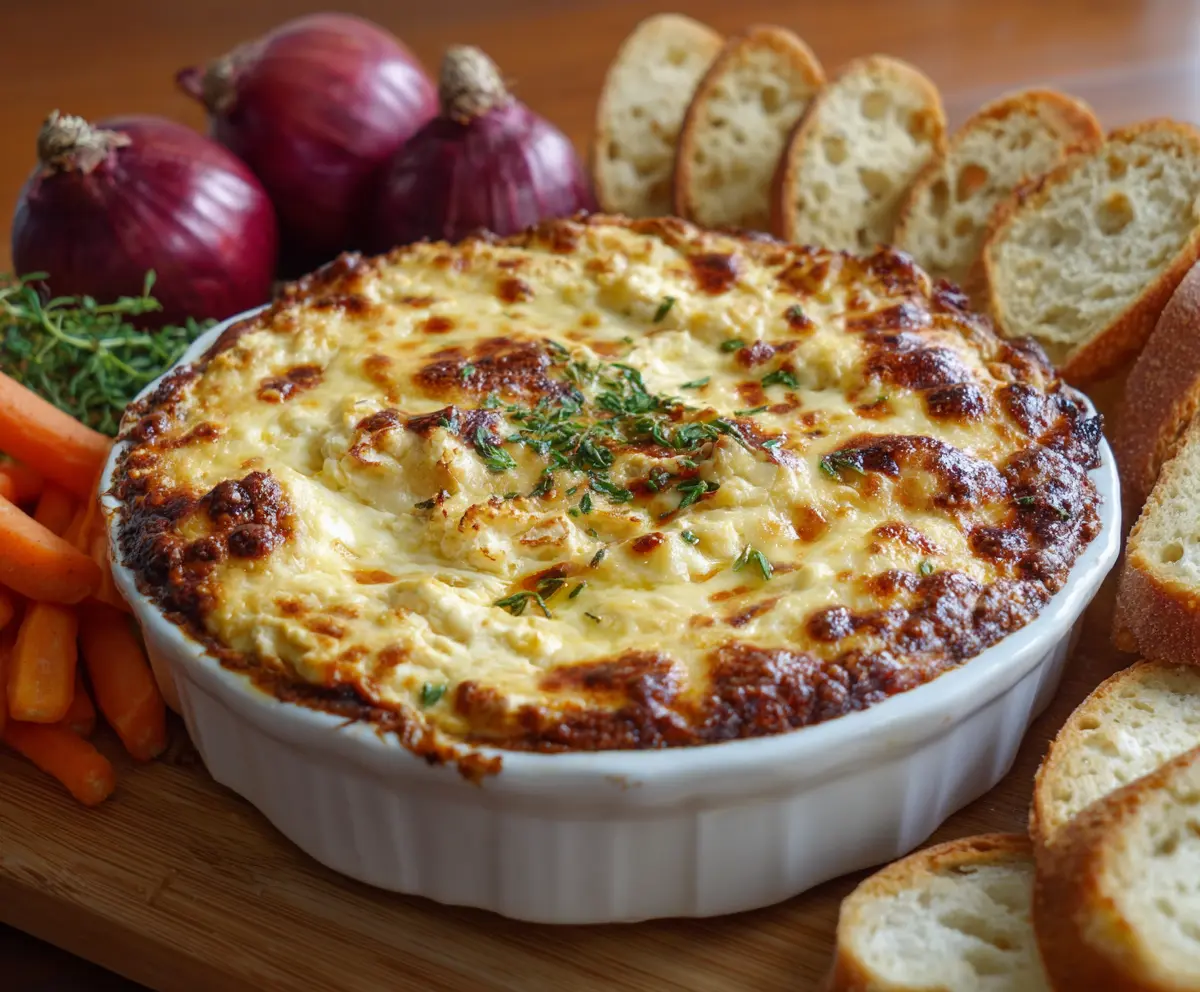 This warm and cheesy dip combines two types of cheese and sweet onions for a special treat. It’s creamy, tasty, and perfect for any gathering!