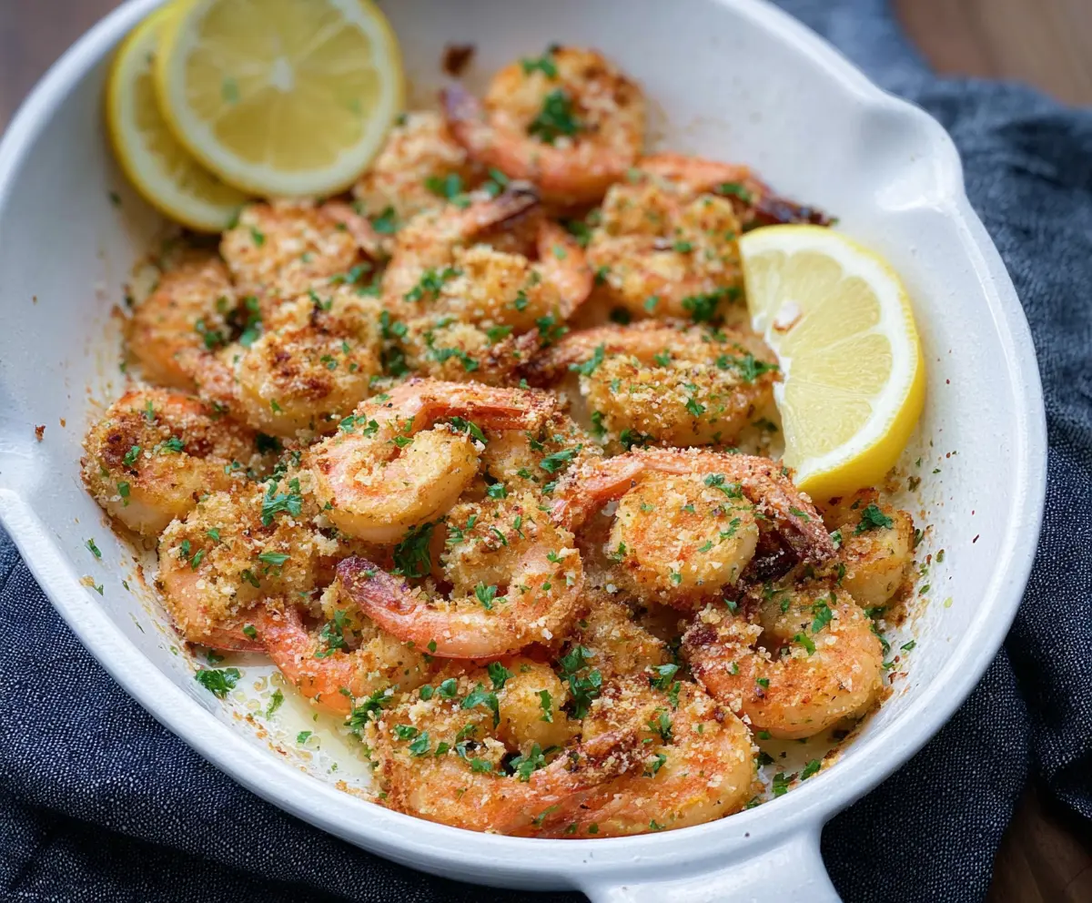 Delicious baked garlic Parmesan shrimp served on a plate with lemon wedges, perfect for a seafood dinner.