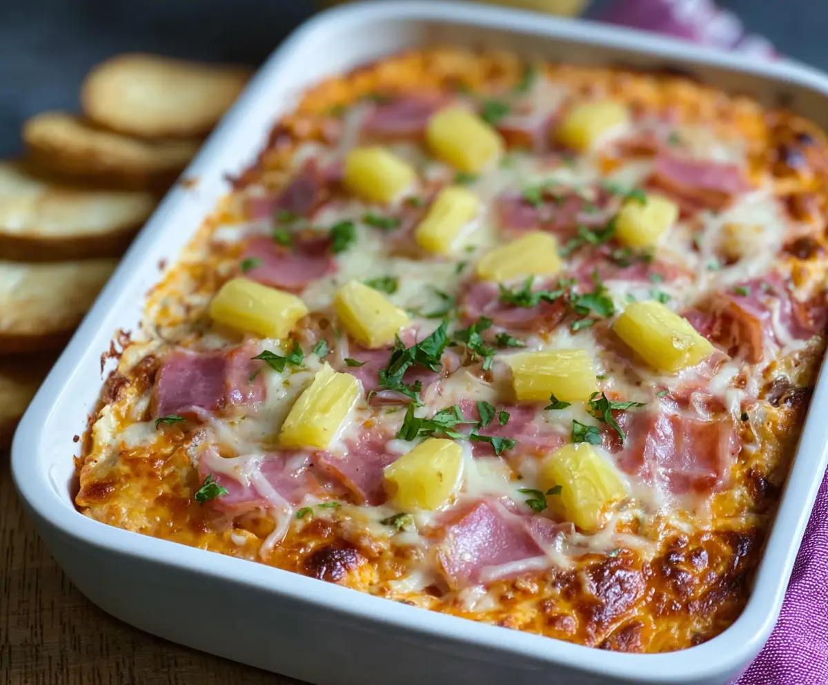 Delicious Baked Hawaiian Pizza Dip with melted cheese, ham, pineapple chunks, and a golden crust