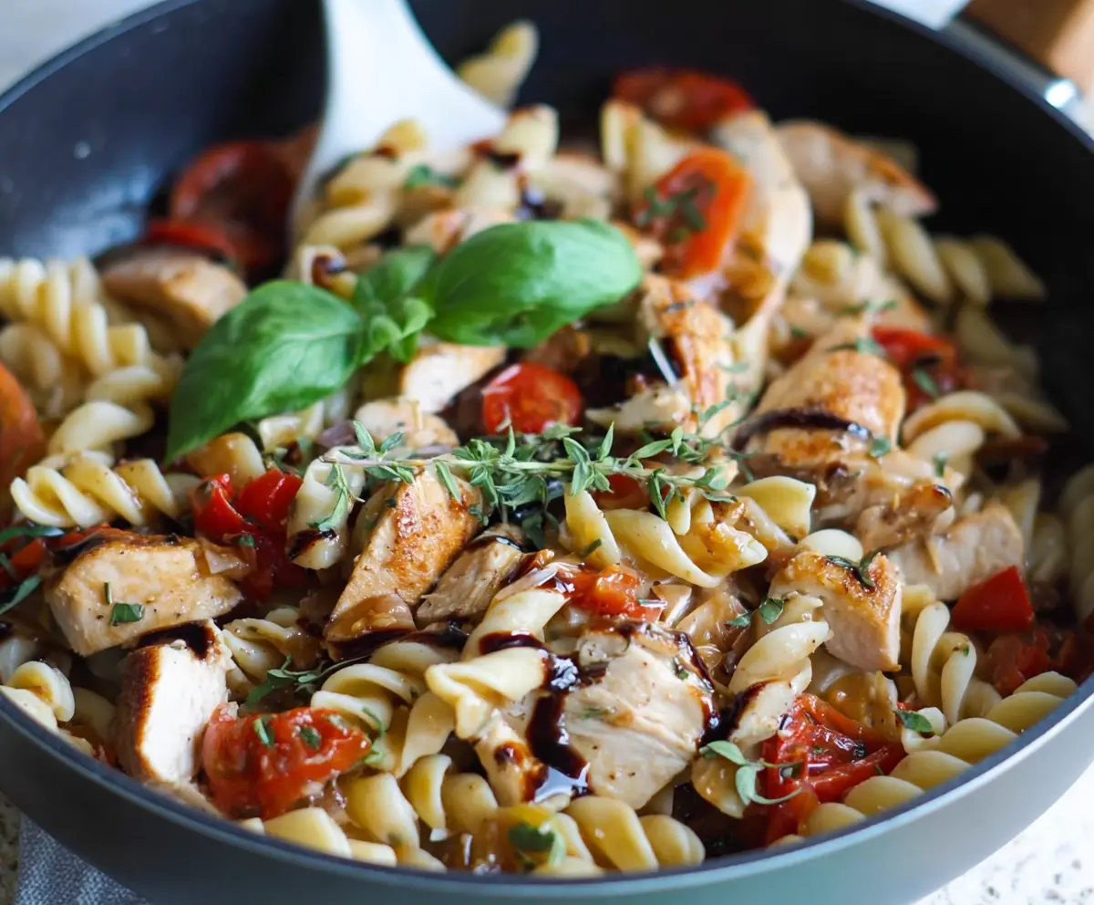 Remove the skillet from heat and garnish your dish with fresh chopped basil leaves for a burst of flavor. Serve warm and enjoy your delightful Balsamic Chicken Pasta!