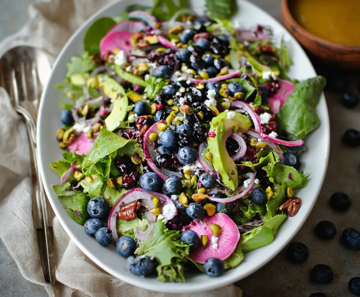 This vibrant salad is a lovely mix of fresh blueberries, crunchy pistachios, and baby greens. It’s perfect for a light meal or a fancy side dish at any gathering!