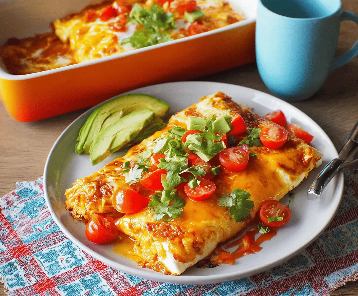 Delicious breakfast enchiladas filled with cheese, eggs, and savory spices on a plate.