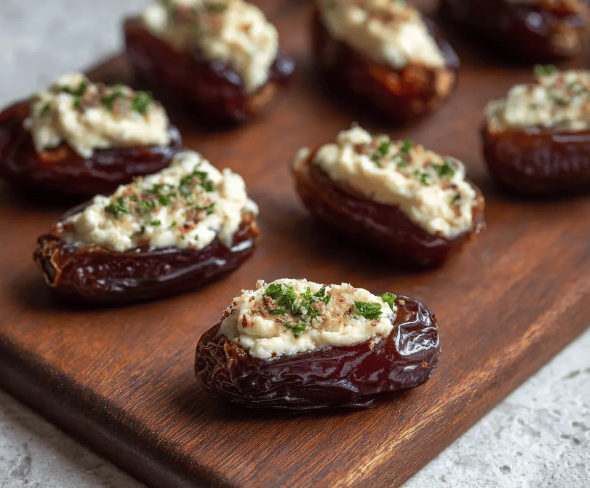 Sprinkle a small handful of toasted chopped walnuts or pecans on top of the cheese-filled dates. This adds a delightful crunch and nutty flavor!