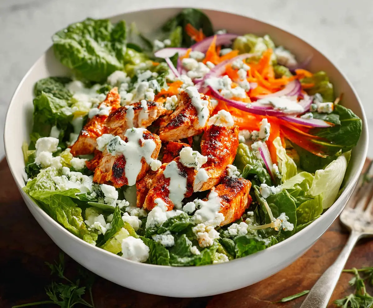 This Buffalo Chicken Salad is a tasty mix of spicy shredded chicken, fresh greens, and crunchy veggies. It’s like a party in a bowl!