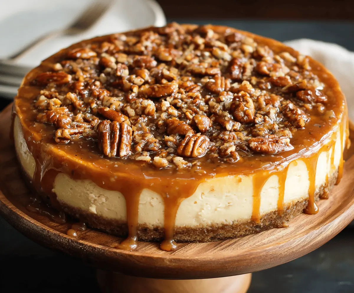 Now it’s time to bring it all together! Pour the caramel pecan topping over the chilled cheesecake, spreading it evenly, and allow some caramel to drip down the sides for that beautiful presentation.