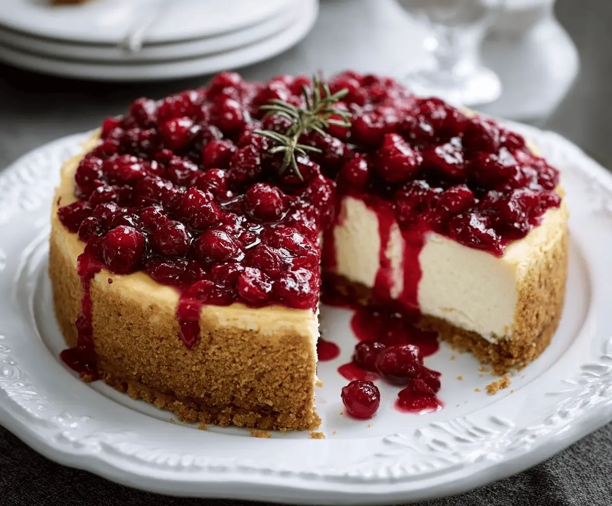This creamy cheesecake topped with bright red cranberries is a festive delight! The sweet and tart cranberry topping adds a burst of flavor that makes each bite special.