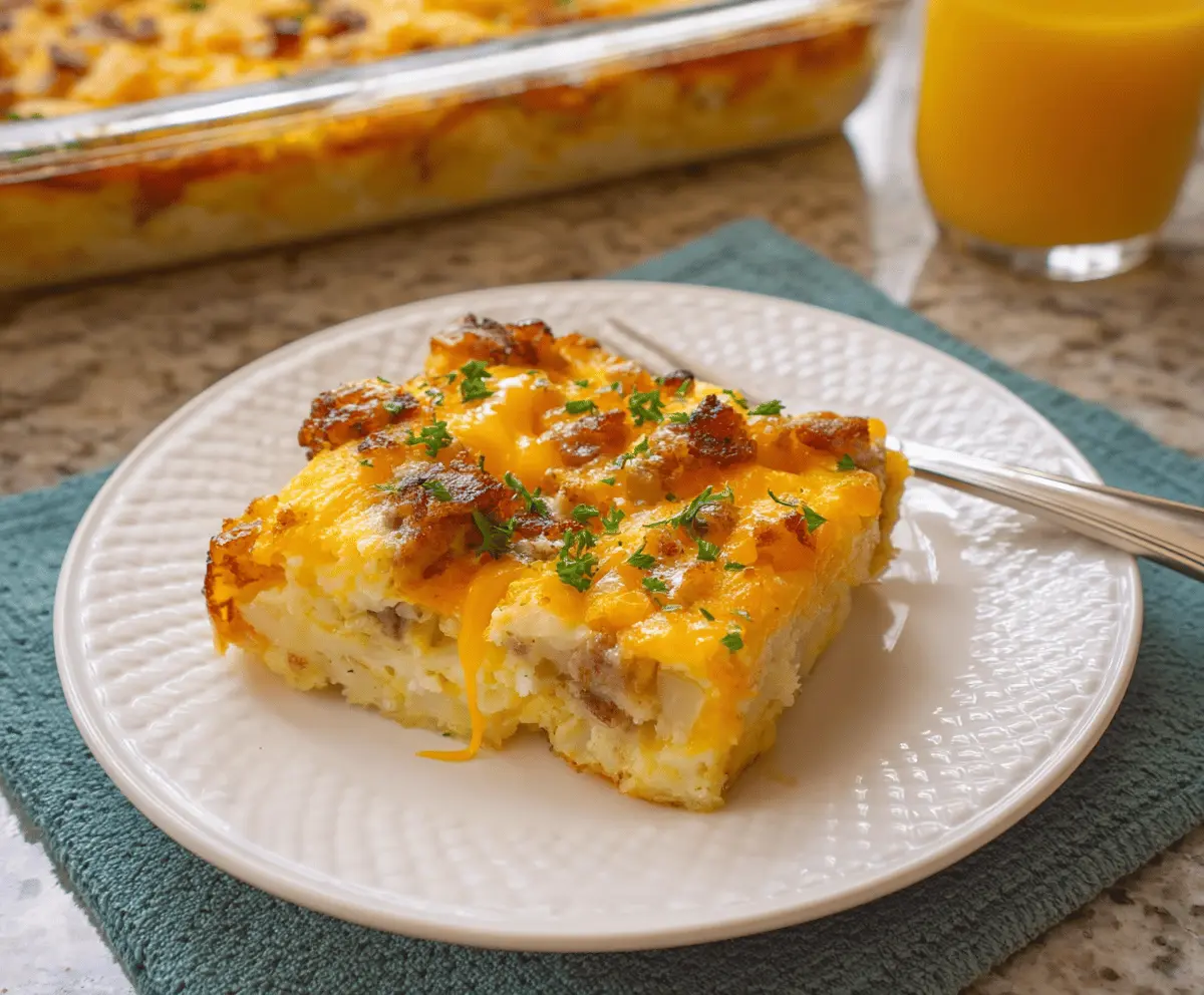 Before serving, garnish with fresh chopped parsley or chives if desired. Serve warm, and get ready for everyone to love this cheesy, hearty breakfast casserole!