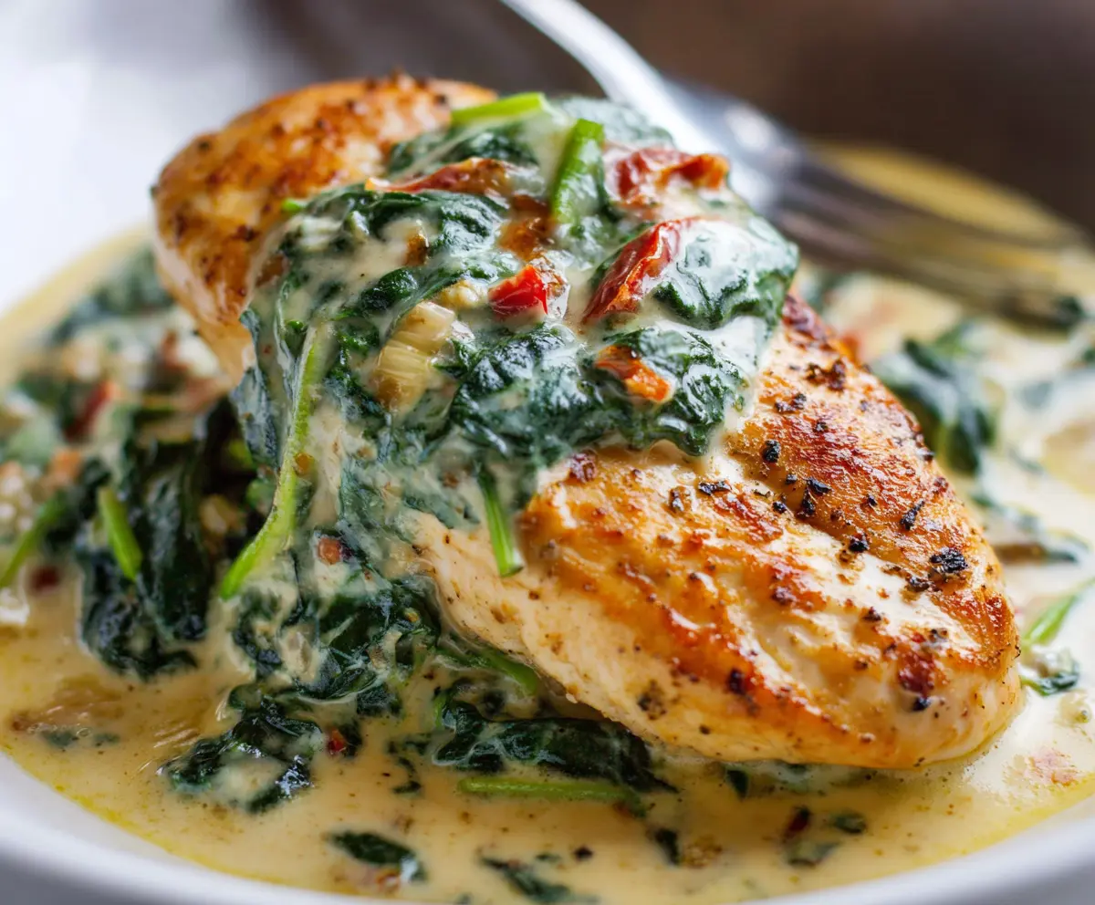 This chicken dish is a real treat! Tender chicken breasts are cooked in a creamy spinach and parmesan sauce that’s rich and flavorful. It’s like a warm hug on a plate!
