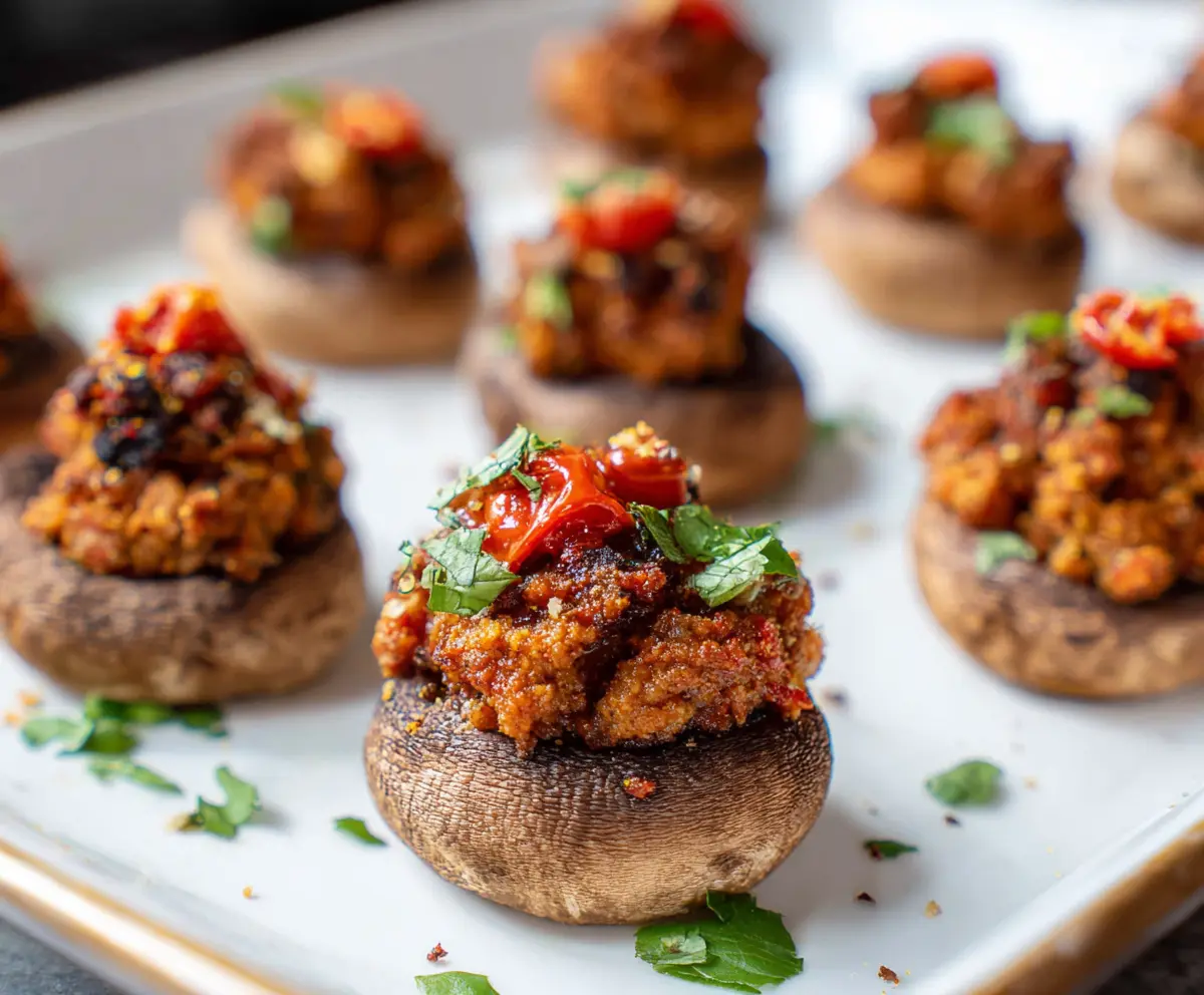 Delicious chorizo stuffed mushrooms served as an appetizer, featuring savory sausage filling in fresh mushroom caps.