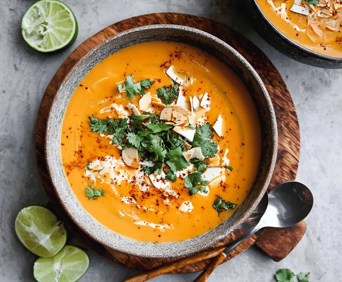 To serve, ladle the soup into bowls and drizzle with additional coconut milk or cream for extra richness. Top with fresh cilantro and toasted coconut flakes, if you like. For that extra zest, serve lime wedges on the side.