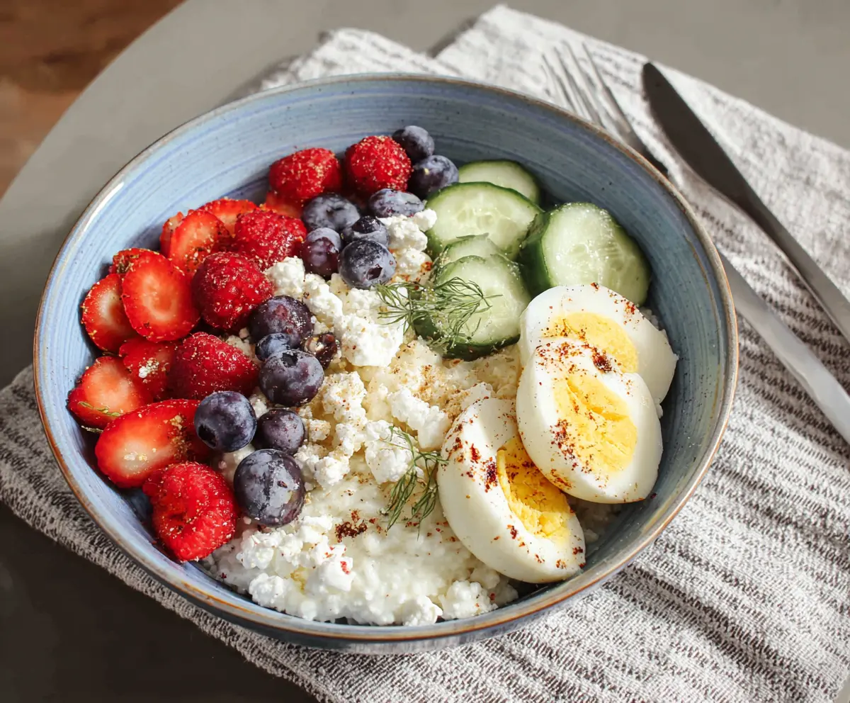 This Cottage Cheese Protein Bowl is a tasty way to start your day! It’s filled with creamy cottage cheese, fresh fruits, and a sprinkle of nuts for that extra crunch. Yum!