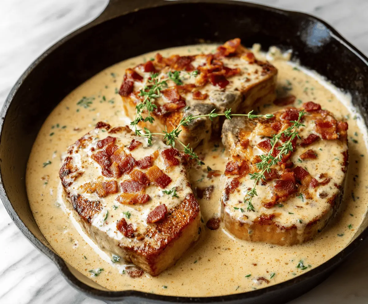 Garnish with chopped fresh parsley and serve the pork chops hot, drizzled with the creamy bacon sauce. This dish pairs wonderfully with mashed potatoes, rice, or a slice of crusty bread for soaking up all that amazing sauce.