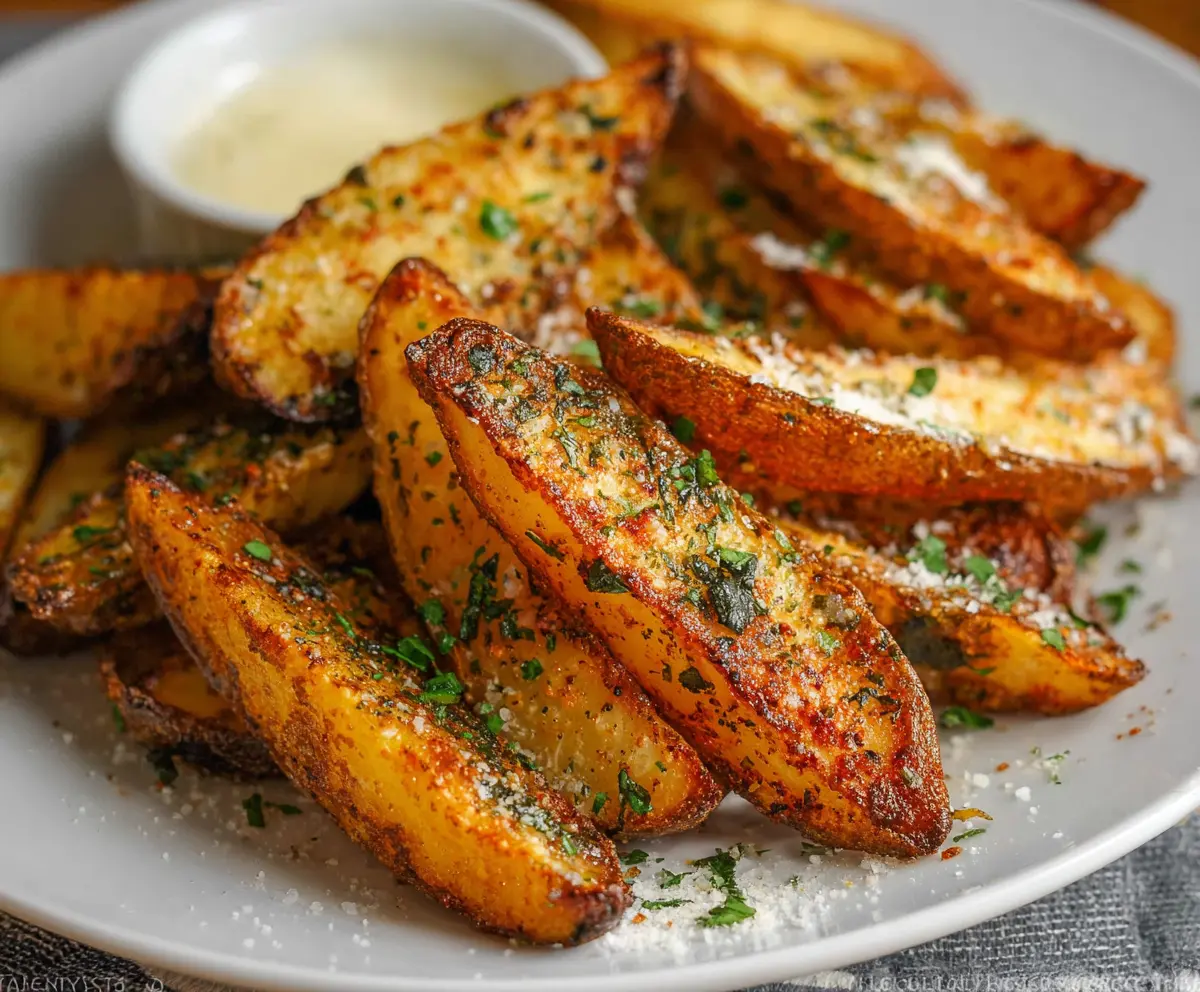 Golden crispy seasoned potato wedges served with fresh herbs for a delicious appetizer or side dish.