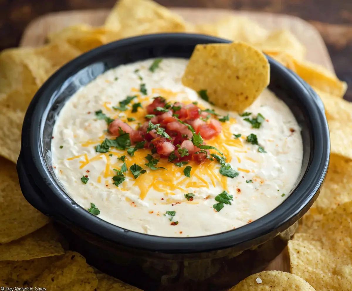 Creamy crock pot white cheese dip served with tortilla chips, perfect for parties and gatherings.