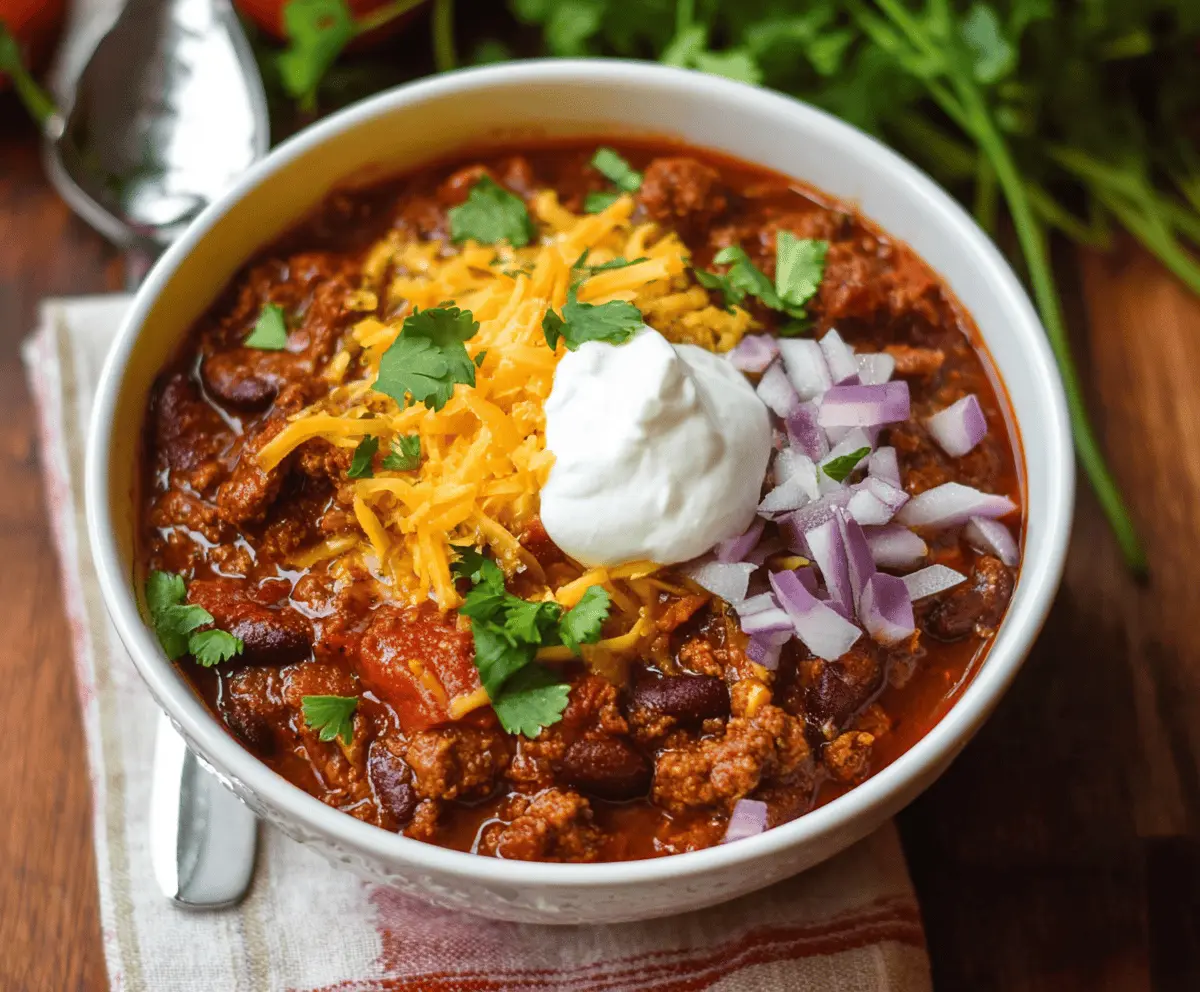 Serve your chili hot, topped with your favorite toppings like shredded cheddar cheese, chopped red onion, sour cream, and fresh cilantro. Enjoy your hearty and flavorful crockpot chili!