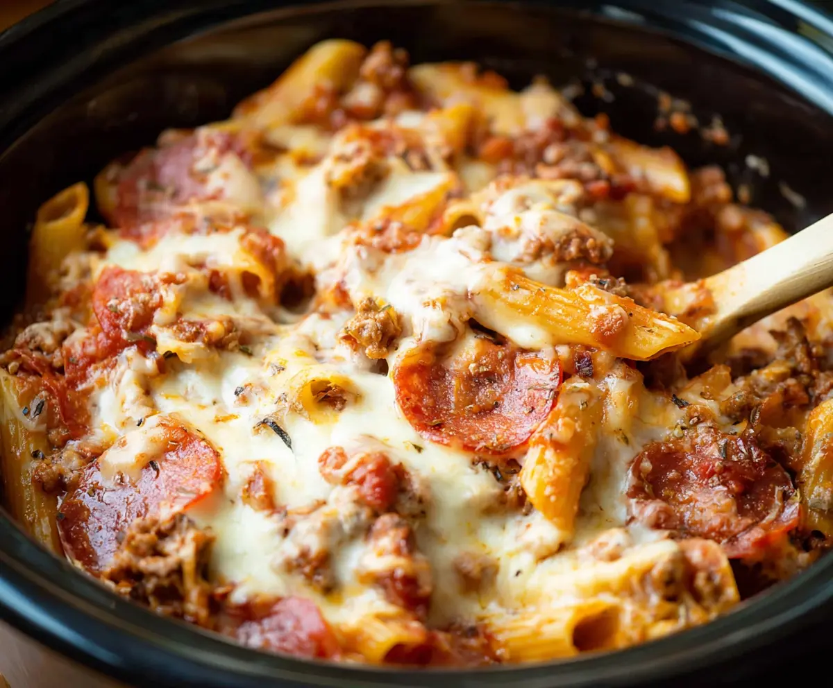 This recipe creates a hearty, cheesy casserole loaded with classic pizza flavors, all conveniently cooked in your crockpot. Perfect for family dinners or gatherings!