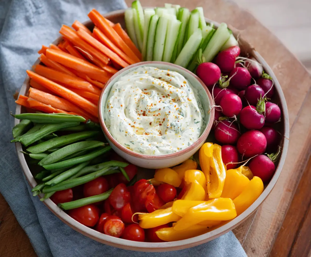 Once your platter is ready, it’s time to serve! Enjoy dipping the fresh veggies into the creamy, herb-flavored dip. It’s a great snack for parties or a quiet night in!