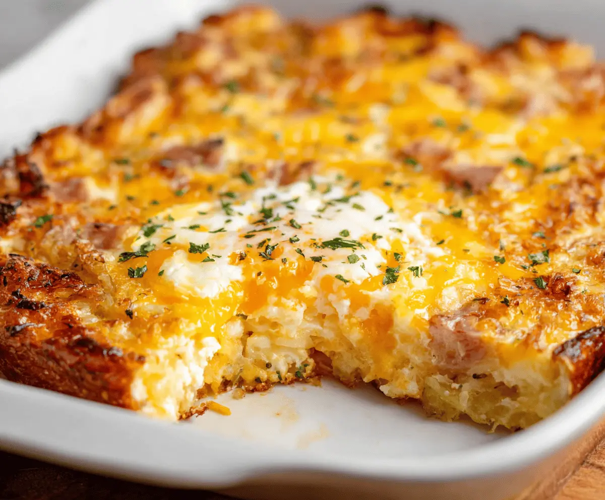 This Egg and Hashbrown Casserole has a beautiful golden crust with a soft, cheesy interior. Each bite is filled with flavor, and the melty cheese on top, along with bits of bacon and herbs, adds a delicious finishing touch. Enjoy! 🍽️