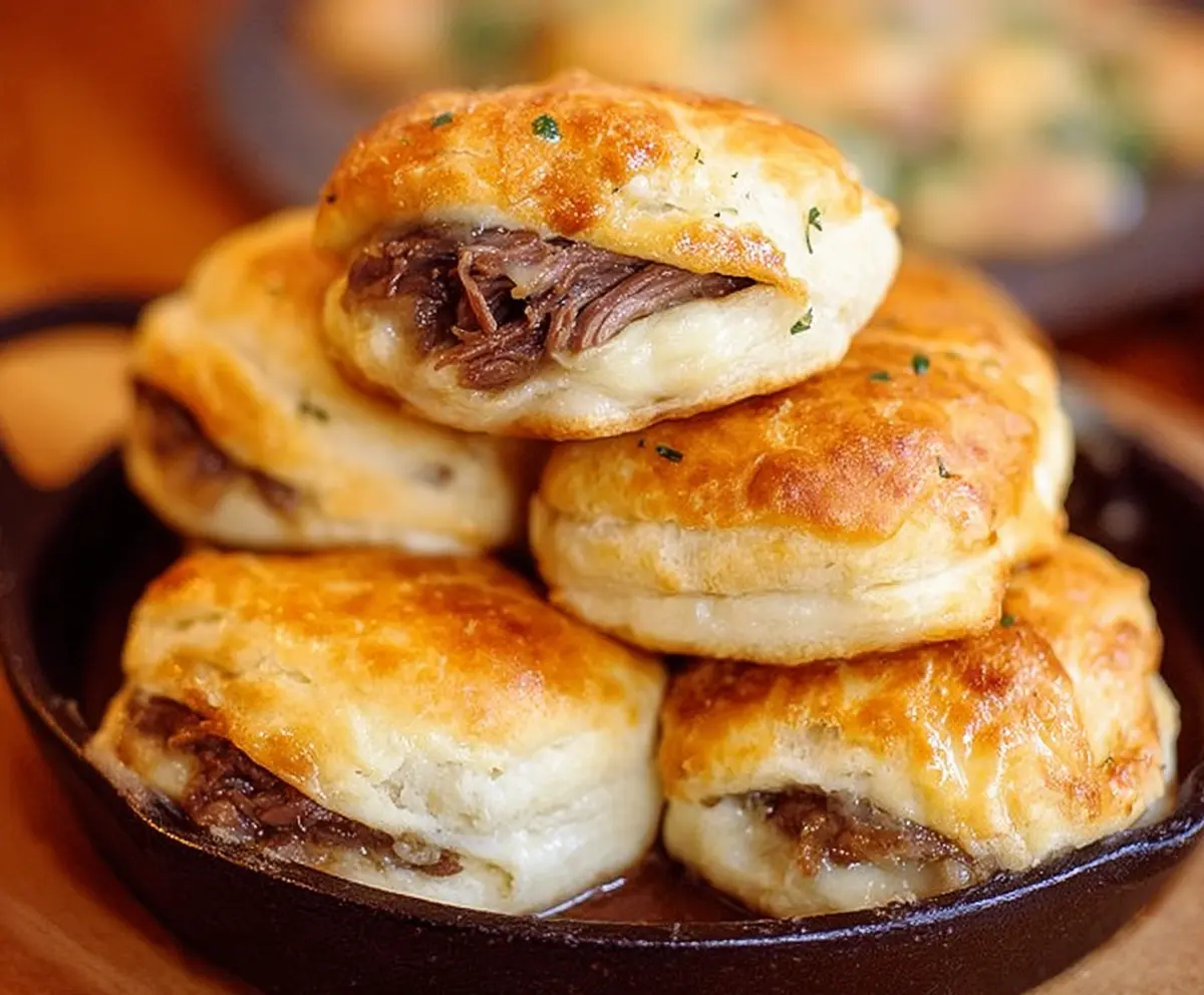 These French Dip Biscuits are a tasty treat that combines flaky biscuits with juicy beef and melty cheese. Perfect for dipping in a warm, savory broth!