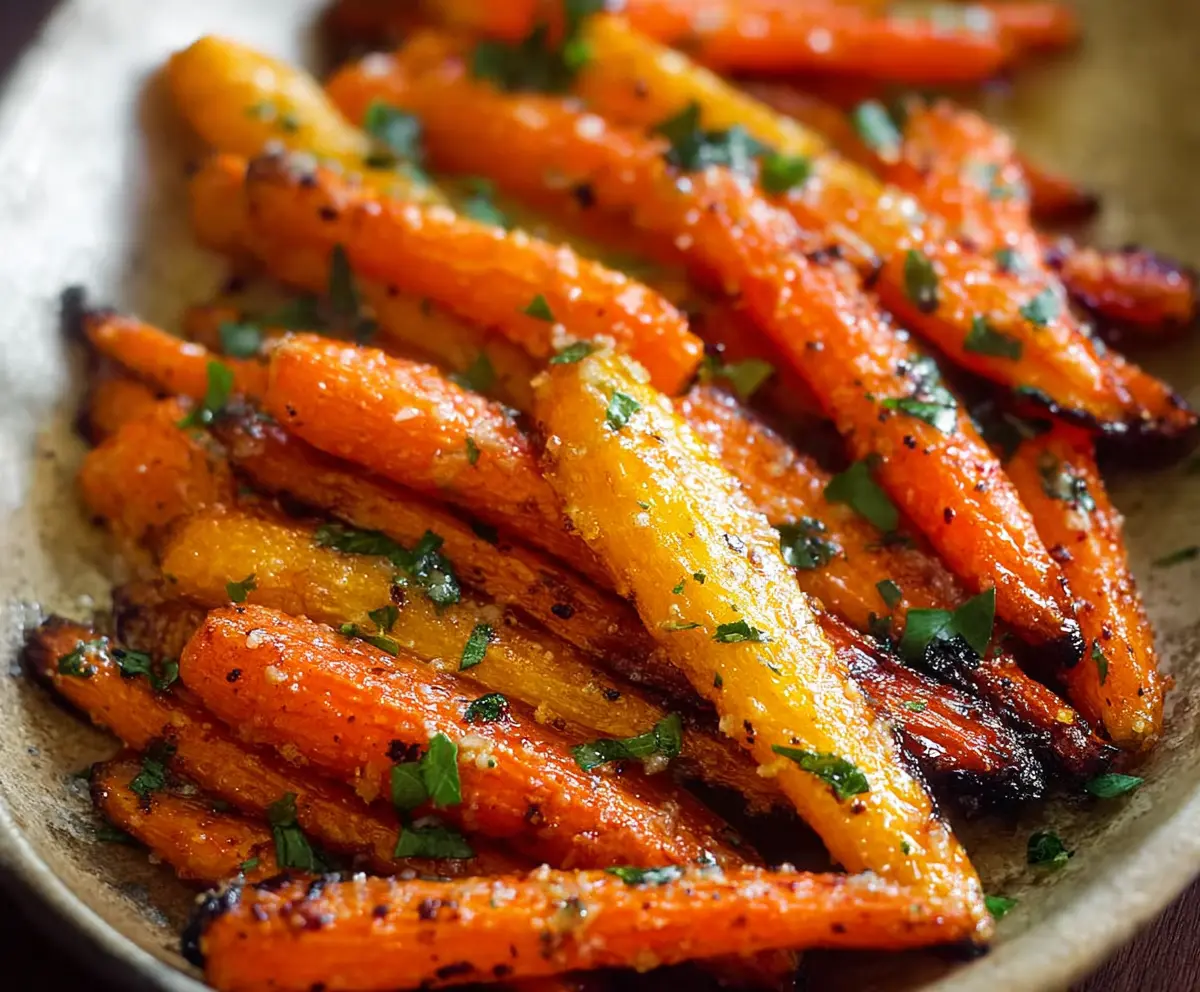 Delicious garlic Parmesan roasted carrots on a plate, garnished with fresh herbs
