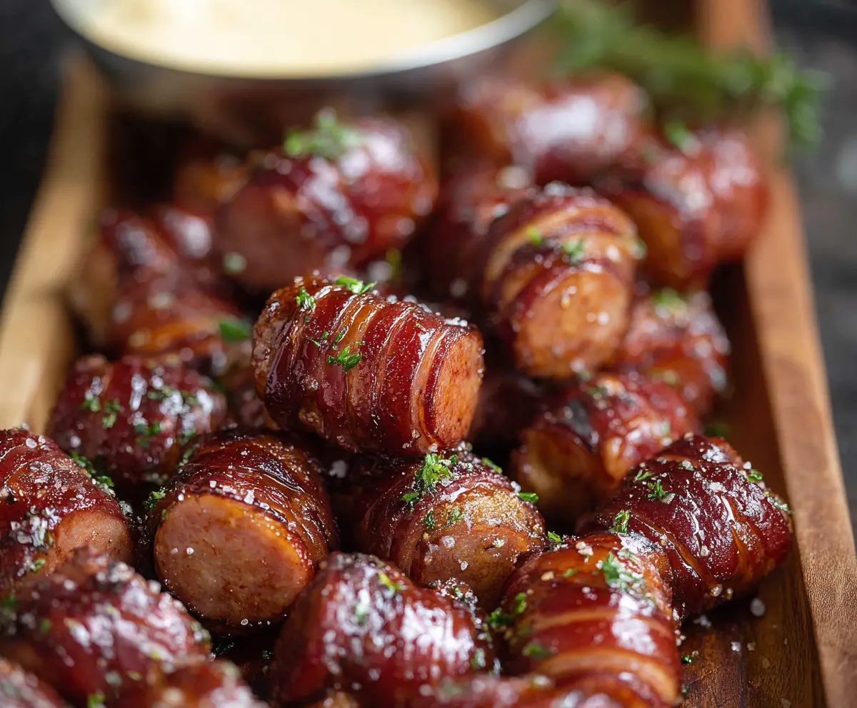 Now it’s time to wrap! Take a slice of bacon and gently wrap it around each kielbasa piece, making sure to tuck the end underneath. This holds the bacon in place while it cooks.