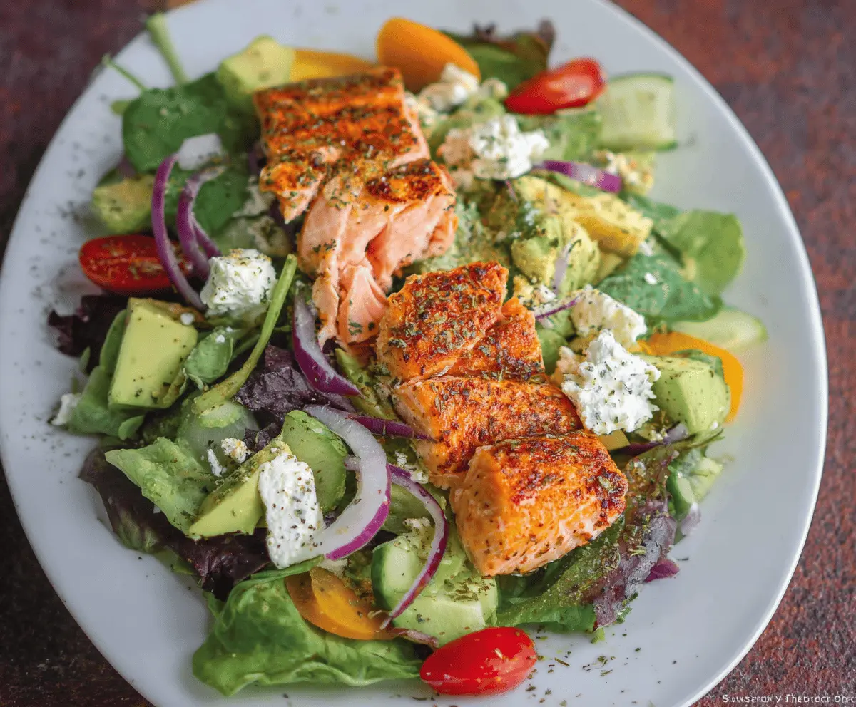 Finally, place the cooked salmon fillets right on top of the salad. Squeeze a fresh lemon wedge over the salmon and salad just before serving to brighten the flavors. And there you have it, a refreshing and healthy salmon salad ready to enjoy!