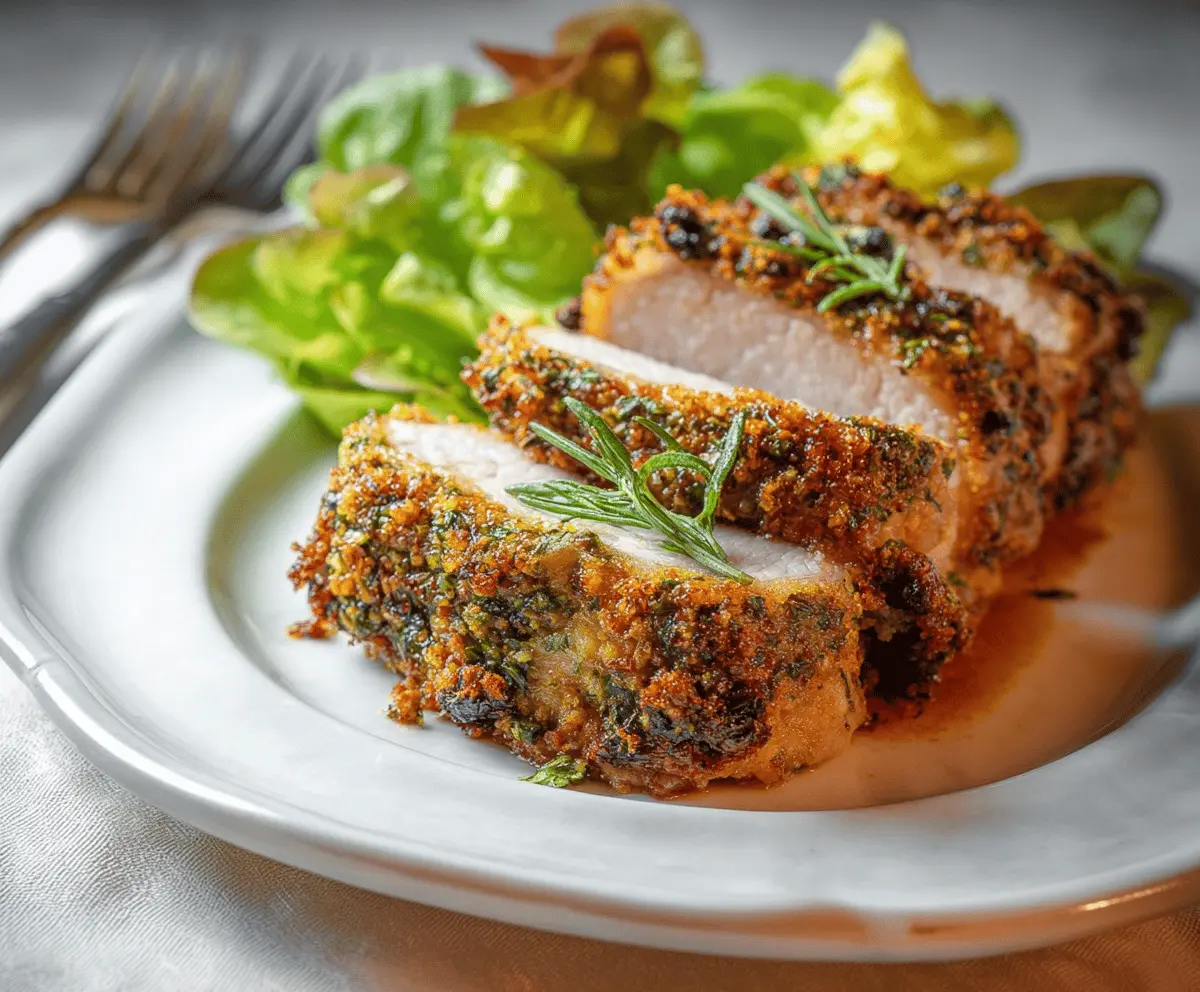 This recipe creates a flavorful, crispy herb crust that locks in the juiciness of the pork, making for a deliciously tender main course. Bon appétit!