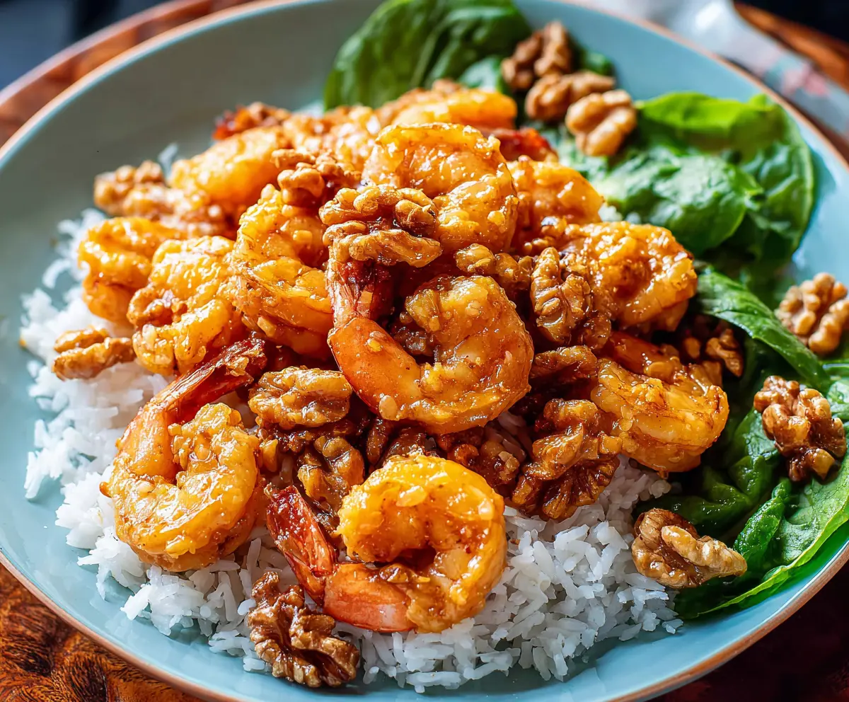 Gently toss the fried shrimp in the honey sauce, ensuring each piece is nicely coated. Serve the shrimp over a bed of warm cooked white rice and add fresh greens for a pop of color. Finally, sprinkle the candied walnuts on top and garnish with chopped green onions or chives if you like.
