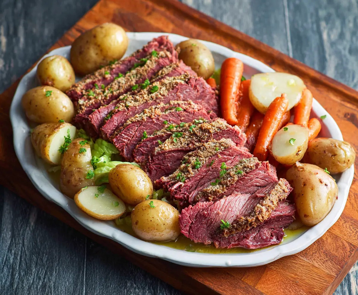 Once the vegetables are ready, take them out and arrange them around the sliced corned beef on a nice serving platter. Make sure to slice the brisket against the grain for the best texture!