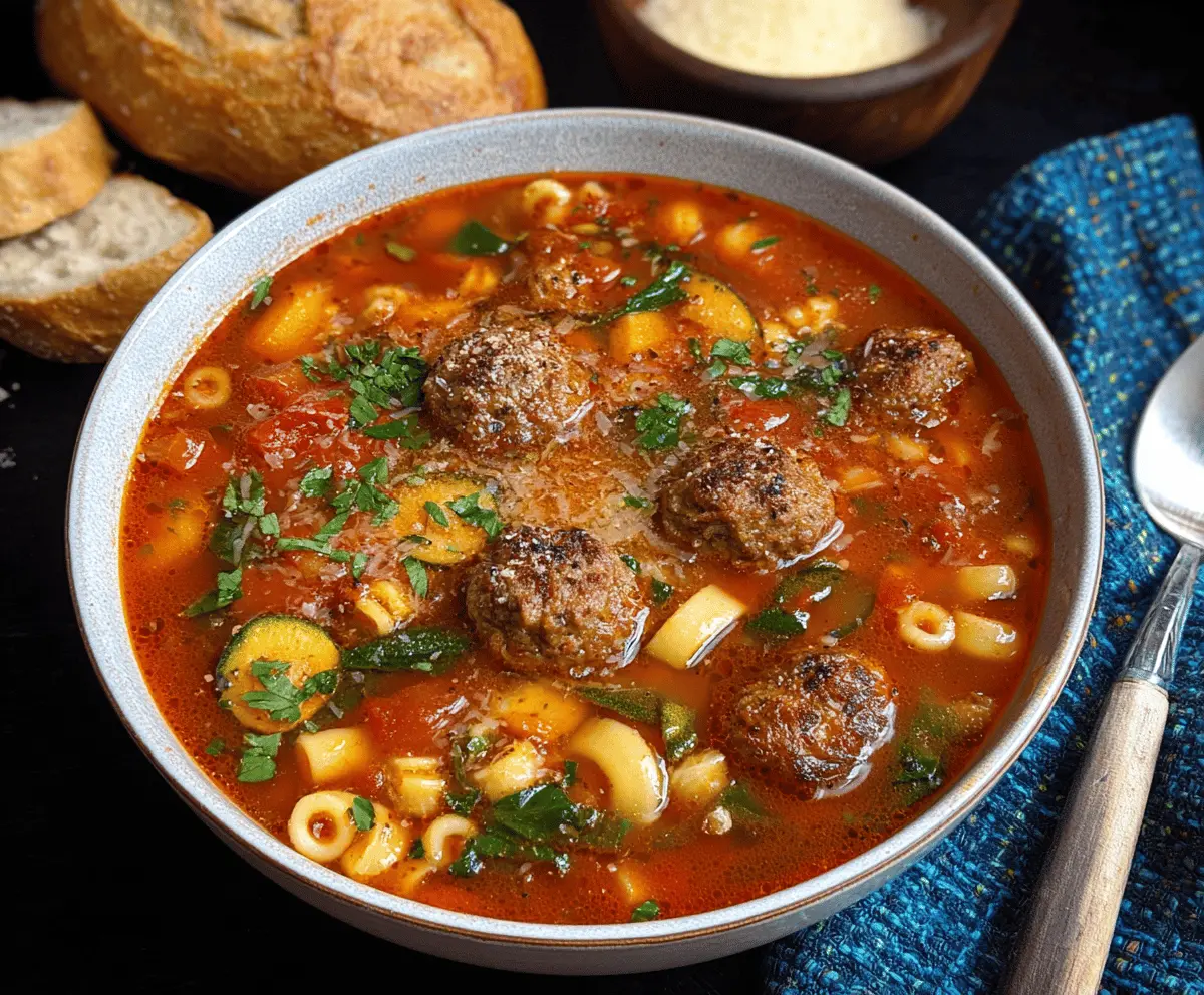Hearty Italian Meatball Soup with fresh herbs, vegetables, and tender meatballs in a flavorful broth