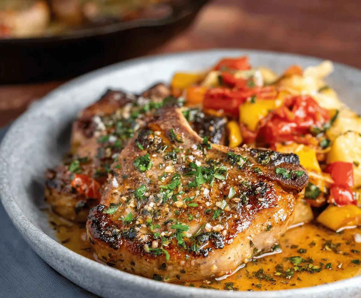 Juicy Italian Pork Chops served with fresh herbs and roasted vegetables on a rustic plate