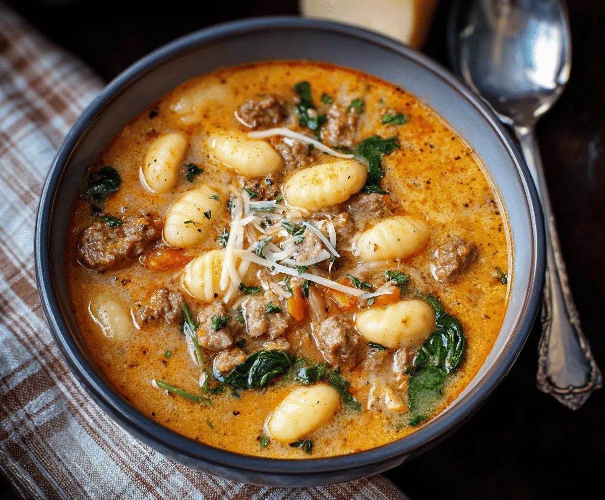 Creamy Italian Sausage Gnocchi Soup in a bowl with sausage, spinach, and gnocchi, garnished with herbs, ready to serve