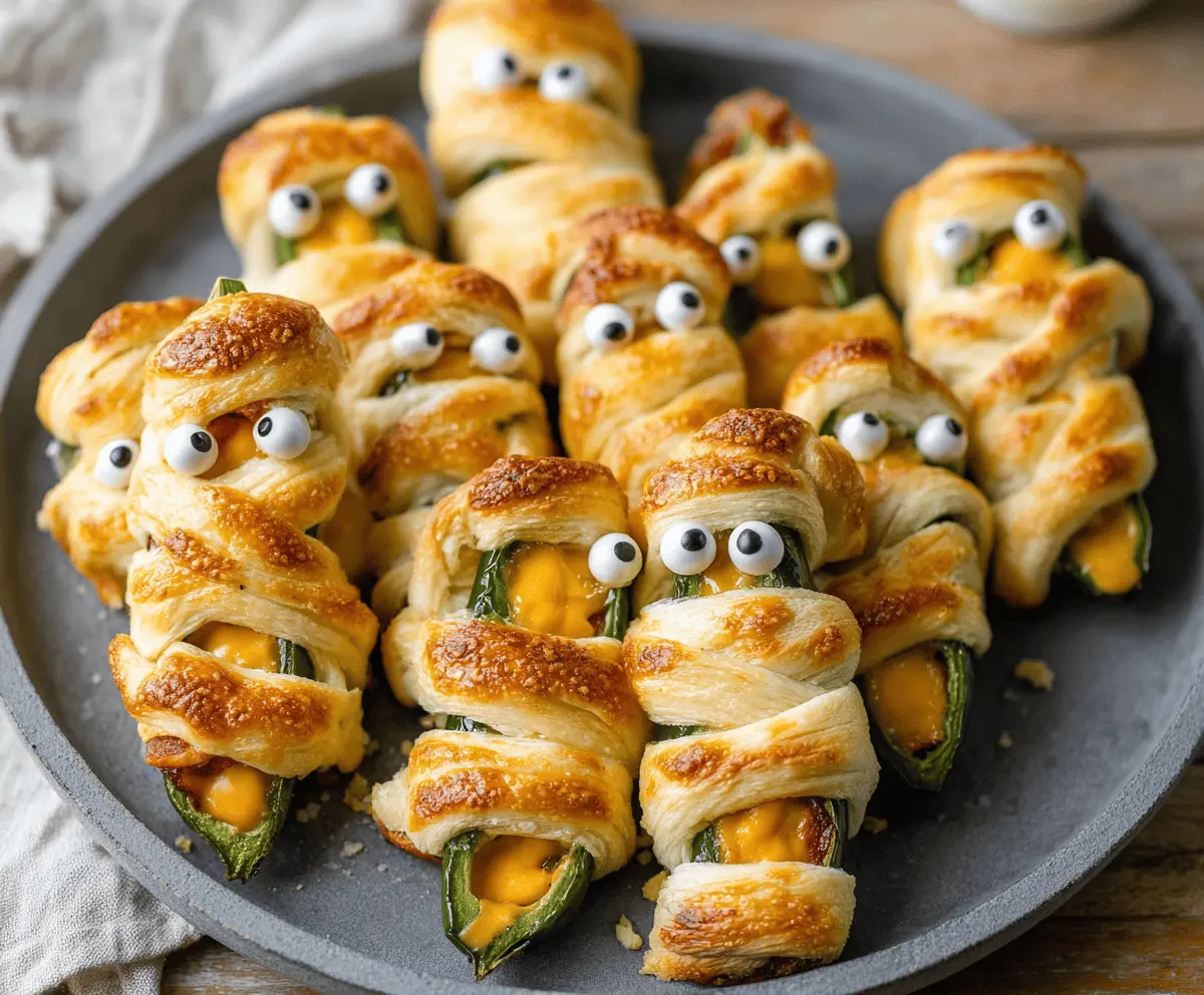 Delicious Jalapeño Popper Mummies featuring crispy puff pastry wrapped around spicy jalapeños and creamy cheese filling, perfect for Halloween parties