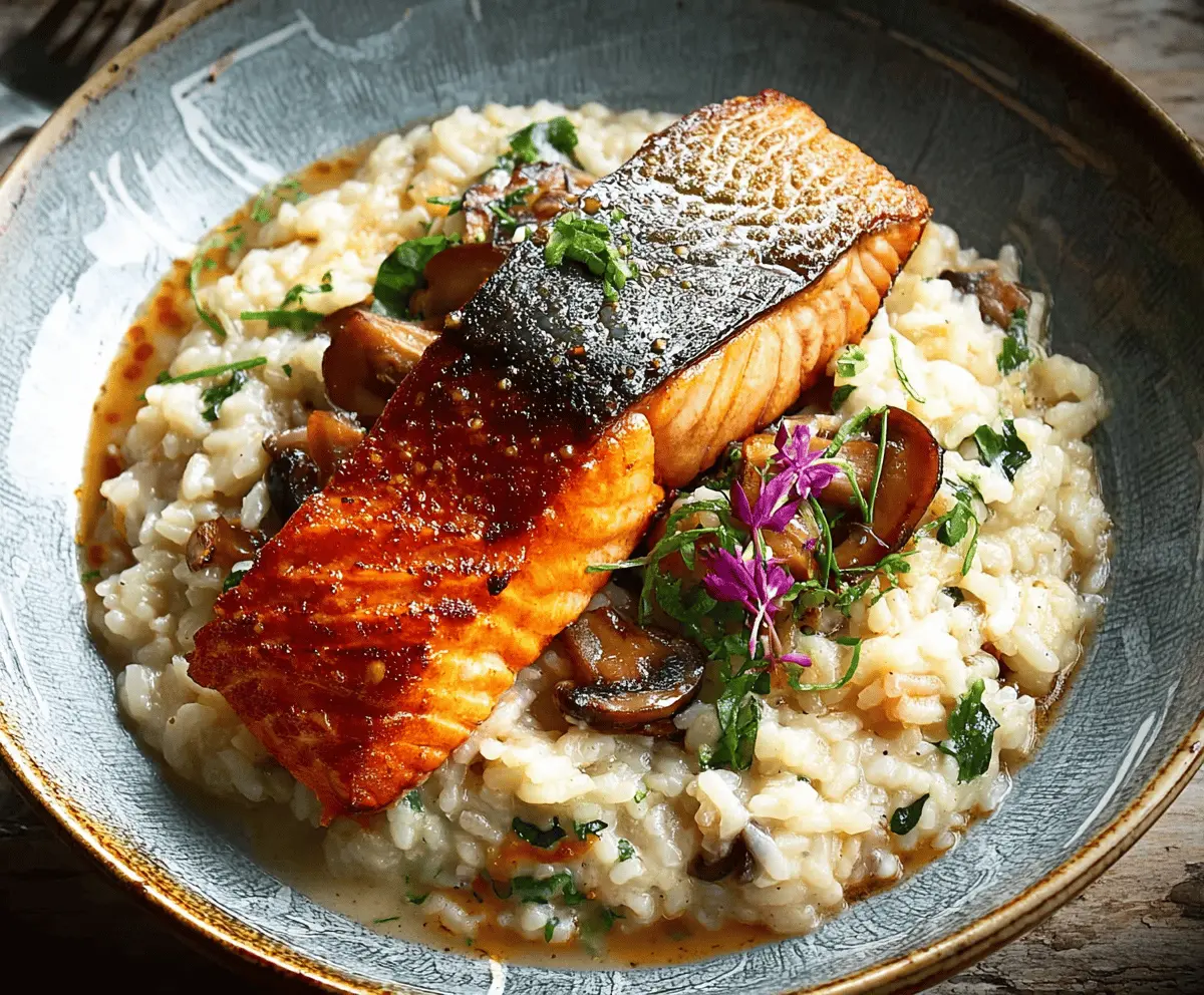 To serve, spoon the creamy risotto into a shallow bowl, place the seared salmon on top, and garnish with finely chopped chives or green onions. Enjoy your delicious and comforting Japanese-style risotto with seared salmon!