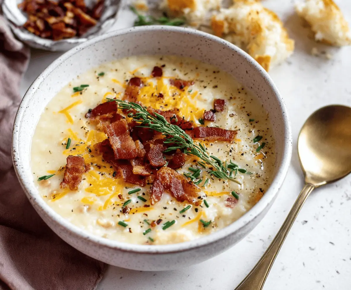 Creamy leftover mashed potato soup garnished with herbs in a bowl, perfect for a cozy meal