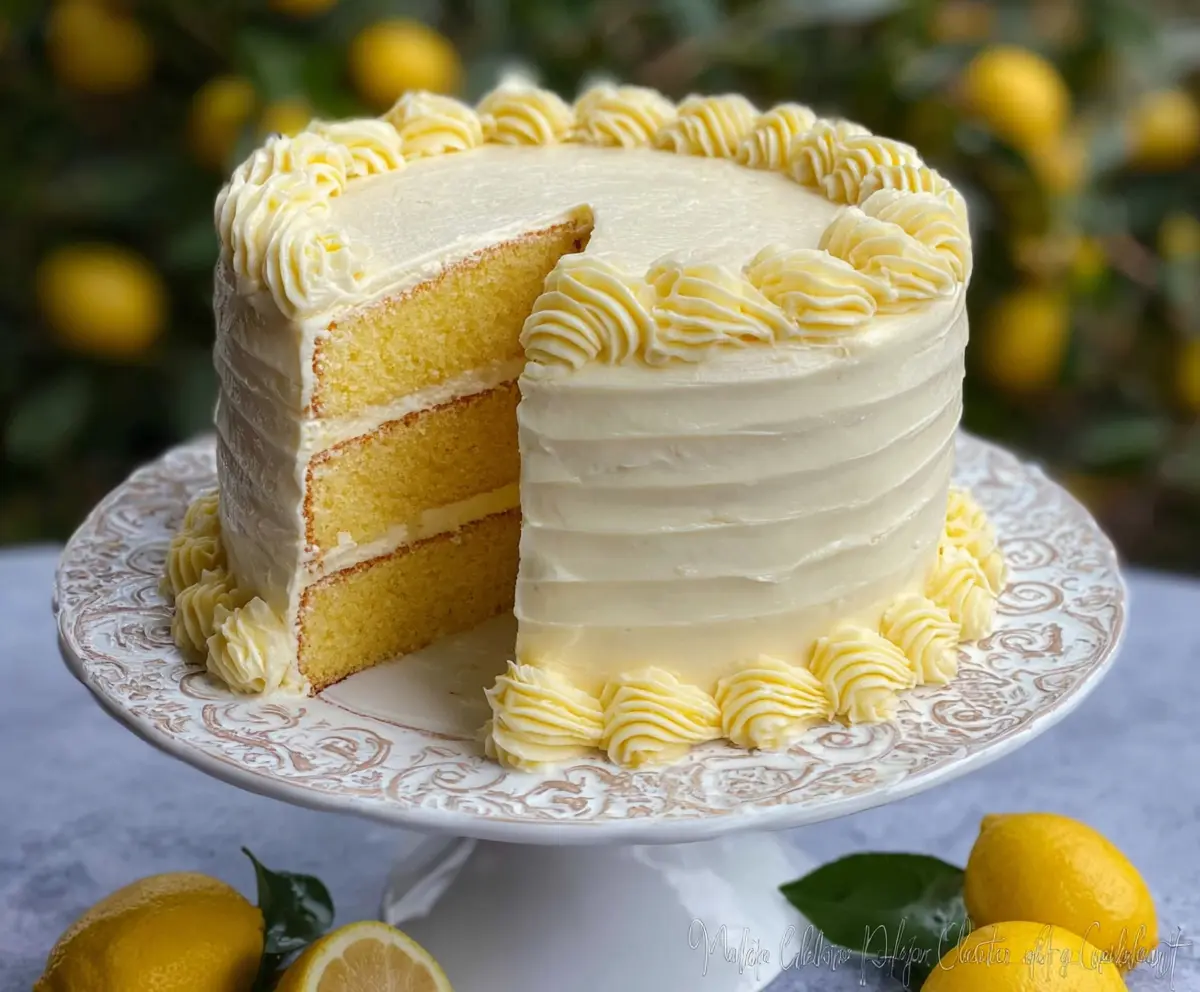 Delicious Lemon Velvet Cake with a smooth lemon-flavored frosting and a moist, fluffy interior displayed on a decorative plate