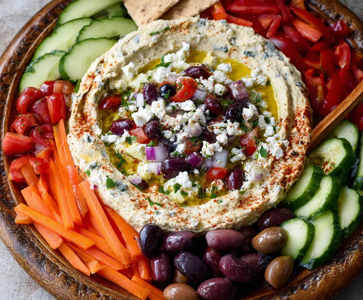 This Mediterranean Hummus Dip Platter is a colorful mix of creamy hummus, fresh veggies, olives, and warm pita bread. It’s perfect for sharing at any gathering!