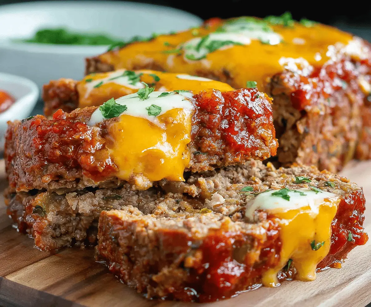 Juicy Mexican Meatloaf topped with melted cheese, garnished with fresh cilantro and served with a side of vibrant salsa, perfect for a flavorful dinner.