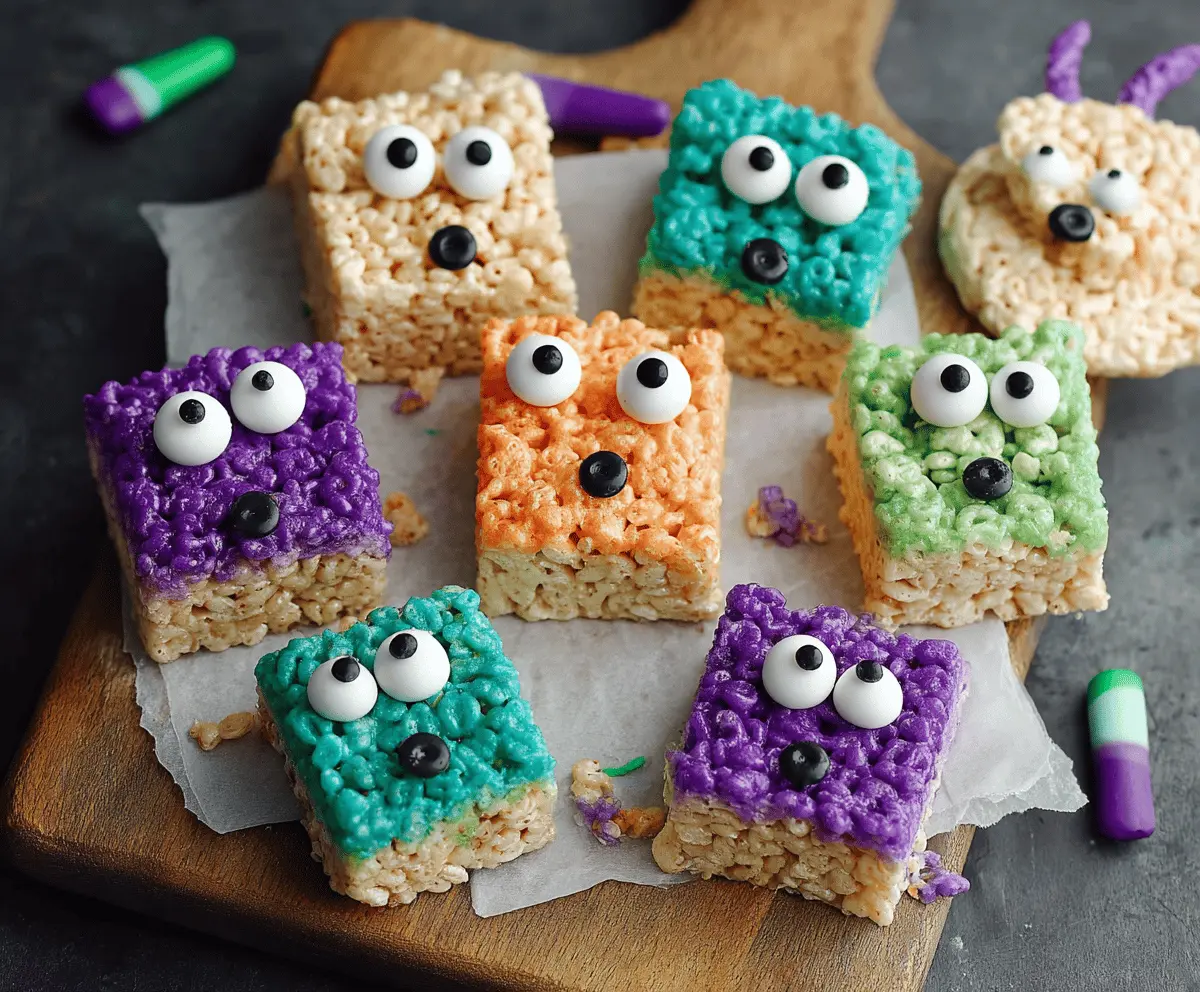 Once they’ve cooled and set, cut the treats into squares. Make sure each piece has a colorful top with those fun eyeballs! Serve and enjoy your adorable Monster Rice Krispie Treats!